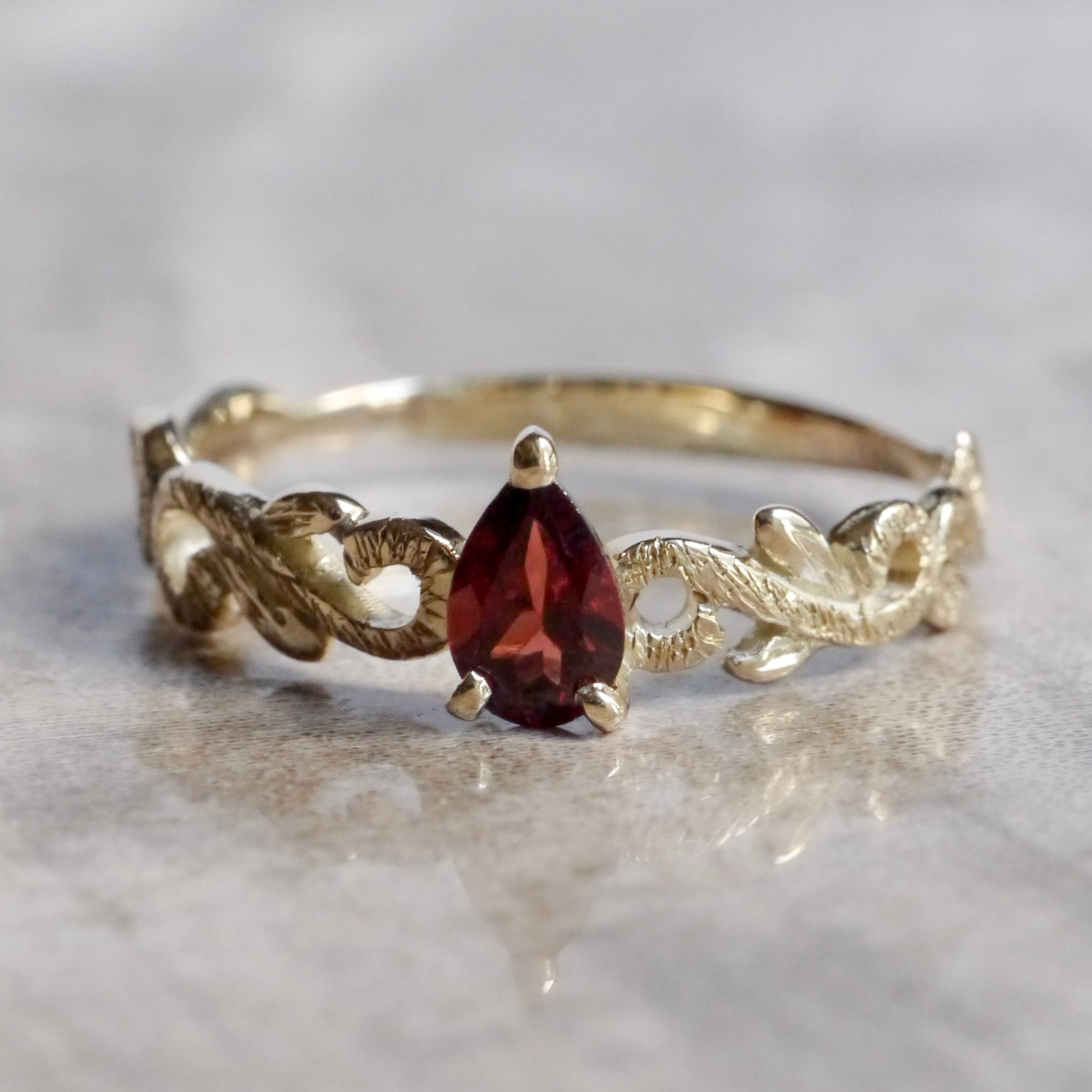 ガーネットを雫のように指先へ添えたK10リング。